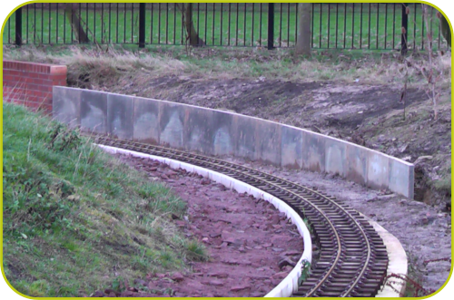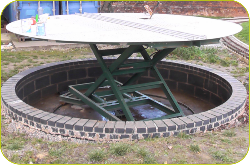 Please note that the full Chairman’s reports from the newsbriefs can be downloaded by clicking on the respective Date Heading. The downloads are in the pdf format.August 2014.•Pointing of the top layer of bricks of the turntable pit has been completed and the last few yards of track between the end of the spur and the turntable has been laid. The area between the container/loco shed and the turntable has been concreted and a piece of removable track constructed that bridges the gap between the turntable and any one of the three tracks in the container/shed.March 2014.•The turn table is virtually complete, with only the railings to paint in top coat and a small amount of pointing remaining.December 2013.•The turntable has now been fully installed complete with its hydraulic lifting pump. The table has been successfully raised to full height using a hand operated lever. The whole of the turn table pit has been covered over with aluminium chequer plate.August 2013.•The turntable is now installed in its pit and painted. The ring on which it rotates was rolled by ourselves and bolted to the concrete floor by ragbolts.March 2013.•The turntable is now well advanced with the construction coming together reasonably quickly. The rotating/elevating structure is totally complete. The turntable pit has been bricked up and back filled to the height of the top of the breeze blocks.December 2012.•The base of the pit for the turntable has been concreted and is now ready for the walls to be built. All the steel, rams, bearings, wheels, building materials etc. have been purchased and a lot of fabrication work, particularly on the lower base section, has been started.August 2012.•Grass seeding has now been completed in the remaining area of the new loop extension and is by now well established.•There has been limited physical progress to report on the proposed turntable, except for a very large excavation were the turntable is to be constructed.•The track repairs in the vicinity of the catenary at the approach to the 1 in 22 grade, have been completed.March 2012.•Chippings have now been spread throughout the length of the new loop and all that remains to be done is seeding of the top soil.•There is no progress to report on the turntable project due to other priorities.•Trackwork still needs to be attended to in the area of the catenary to the 1 in 22 gradient.December 2011.•It was reported that the extended loop project was now complete. Further landscaping had been carried out, mainly levelling areas ready for seeding.•Construction of the turn table, outside the proposed loco shed, has commenced with excavation work complete Details of the actual mechanics of the turntable have still to be finalised.•A number of concrete slabs have been laid under the track, where it starts to rise up the gradient, in order to correct the undulations in the track.August 2011.•Work on the extended loop continues and is now getting close to completion. There is only the topsoil to spread on one side of the cutting, the placing of track ballast and the sowing of grass seed.March 2011.•Most of the hard landscaping of the track extension is now complete. The flagstone edging of the outer radius is finished and the new HALT platform has been built. Landscaping needs to be completed prior to sowing the area with grass seed and finally putting in the track ballast.December 2010.•Landscaping of the new extension continues with edging stones along the whole length of the inner radius installed and a start made on edging the outer radius.